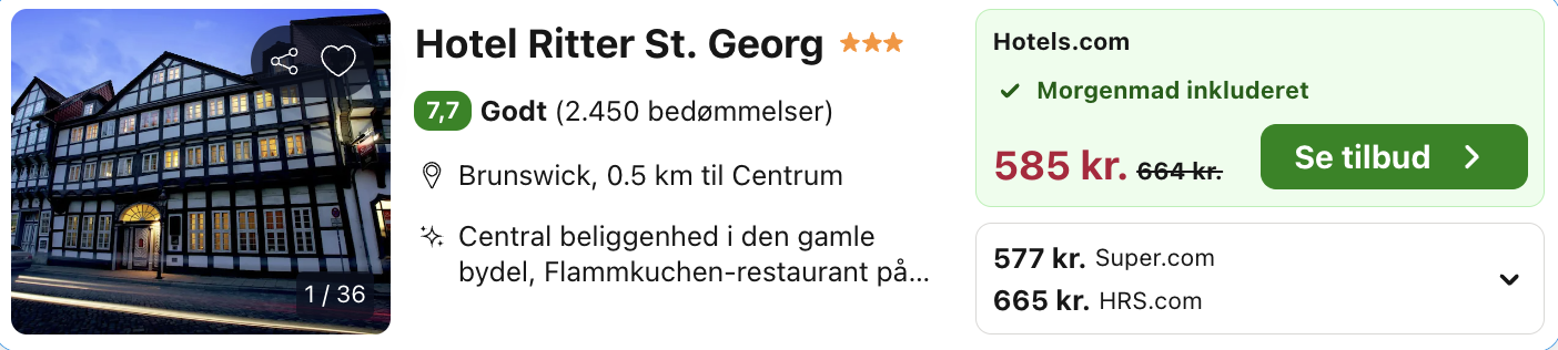 Hotellet hedder Hotel Ritter St. Georg og har til huse i en traditionel træbygning fra det 15. århundrede. Hotellet ligger centralt i Braunschweig og værelserne på stedet har rustik indretning med fritliggende træbjælker. Prisen er inkl. morgenmad.