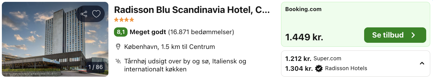 Vi har taget udgangspunkt i et ophold fra den 10. – 11. maj på Radisson Blu Scandinavia Hotel, Copenhagen, der er et moderne og luksuriøst hotel beliggende i hjertet af København, tæt på byens største seværdigheder, shoppingområder og kulturliv. Hotellet kombinerer stilfuld indretning med fremragende service og tilbyder et ideelt valg for både forretningsrejsende og turister, der ønsker at opleve byen i komfortable omgivelser.