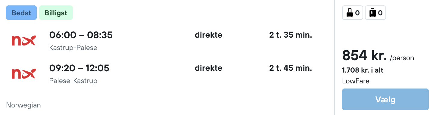 | Bemærk: Husk at lade flysøgningen blive helt færdig! Der kan være mindre prisforskelle på mobil og pc. Undersøg med fordel, hvor det er billigst inden bestilling.