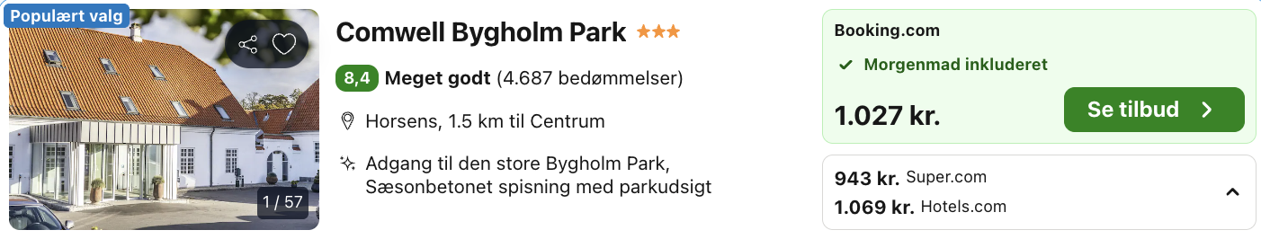 ![]() Bemærk: Den samlede pris for weekendopholdet er 943,- for 2 personer i et dobbeltværelse, hvilket svarer til 472,- per person. Rejs365 er ikke et rejsebureau, men en rejseside, der finder gode tilbud! – Vi modtager kommission, men det påvirker ikke din pris! Læs mere her |