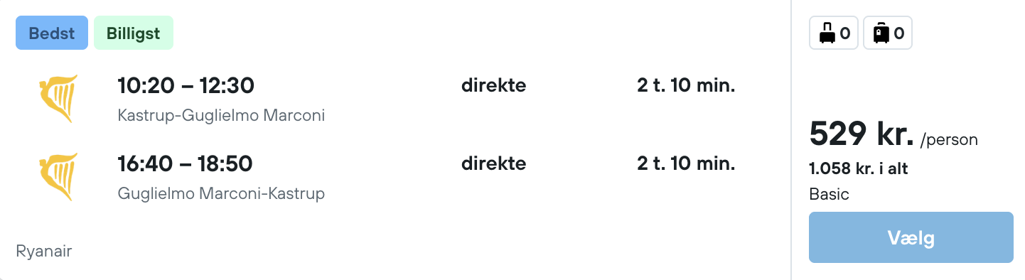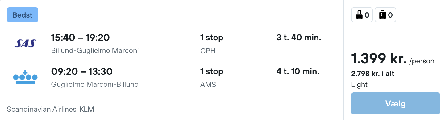 Flyprisen inkluderer kun en lille taske, men bagage kan tilkøbes.