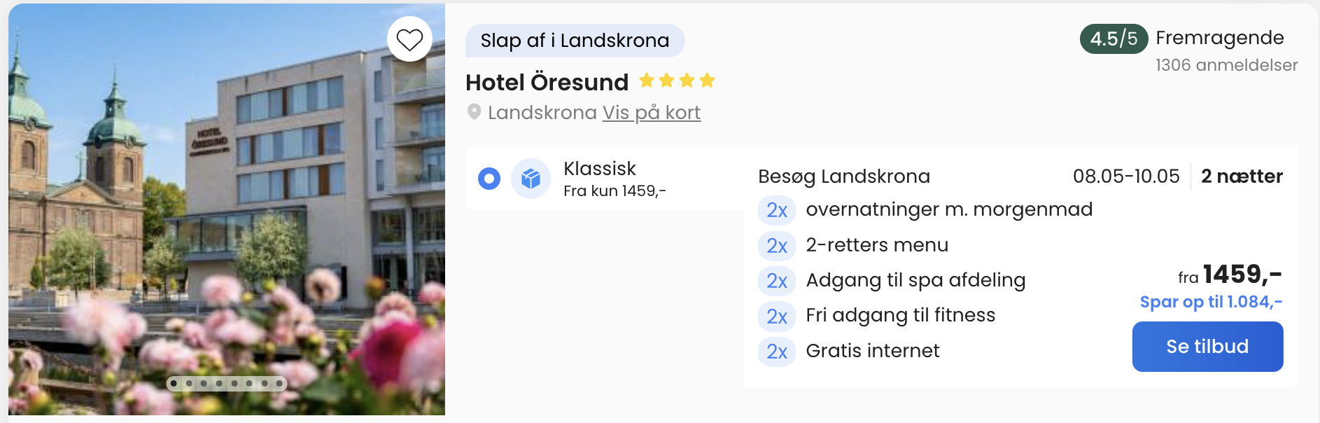 Bemærk: Den samlede pris for opholdet er 3.007,- for 2 personer i et dobbeltværelse, hvilket svarer til 1.504,- per person inkl. obligatorisk ekspeditionsgebyr på 89,- per booking. Vi har taget udgangspunkt i et ophold fra den 8. – 10. maj. Der er flere datoer til samme pris. Rejs365 er ikke et rejsebureau, men en rejseside, der finder gode tilbud! – Vi modtager kommission, men det påvirker ikke din pris! Læs mere her |