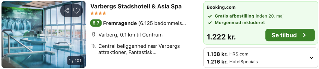 Den samlede pris for opholdet er 1.165,- for 2 personer i et dobbeltværelse, hvilket svarer til 583,- per person.