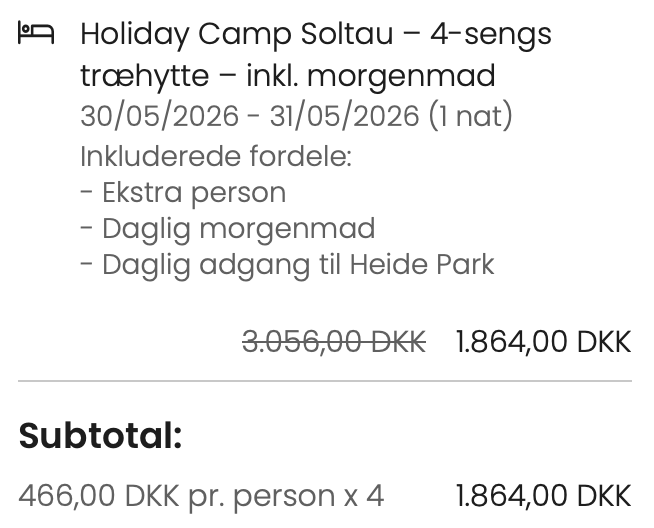 Vi har taget udgangspunkt i et ophold i Holiday Camp Soltau – i en træhytte til 4 personer. Ved et ophold i Holiday Camp er der både inkluderet adgang til Heide Park på ankomstagen samt på afrejsedagen. Derudover er opholdet med halvpension, hvor der indgår ikke alkoholiske drikke til måltiderne samt en snack kupon til brug i parken. Slutrengøringen er ligeledes inkluderet i prisen.