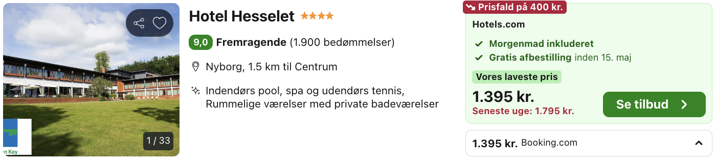 Bemærk: Den samlede pris for opholdet er 1.395,- for 2 personer, hvilket svarer til 698,- per person. Der kan være mindre forskelle i prisen på mobil og pc. Undersøg med fordel, hvor det er billigst inden bestilling. Rejs365 er ikke et rejsebureau, men en rejseside, der finder gode tilbud! – Vi modtager kommission, men det påvirker ikke din pris! Læs mere her |