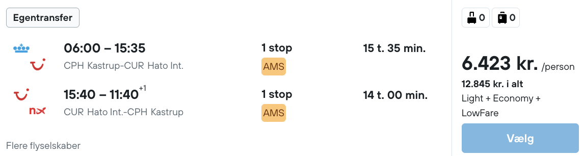 Vær opmærksom på, at flyet vi har taget udgangspunkt i er med egentransfer. Husk at tage højde for at der skal være tid til at hente bagage og checke ind på ny i Amsterdam.
