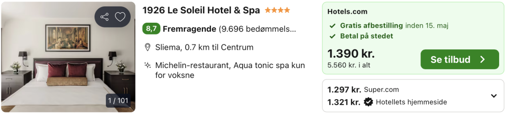 | Bemærk: Den samlede pris for hotellet er 5.188,- for 2 personer i et dobbeltværelse, hvilket svarer til 2.594,- per person. |