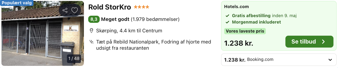 Rold Storkro ligger midt i den smukke Rold Skov og skaber en stemningsfuld ramme for et ophold, hvor naturen virkelig får lov at fylde. Hotellet har en hyggelig og klassisk dansk atmosfære med varme farver, gode materialer og den afslappede ro, som området er kendt for. Værelserne er enkle og behagelige, mange med udsigt til skovens grønne omgivelser, så man vågner med fornemmelsen af at være helt tæt på naturen.