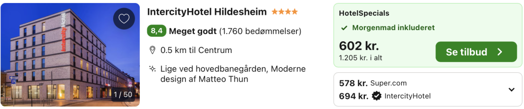 Vi har taget udgangspunkt i et ophold fra den 12. – 14. juni på IntercityHotel Hildesheim, der ligger centralt i den historiske by Hildesheim, kun få skridt fra hovedbanegården og i gåafstand til byens smukke torve, kirker og museer. Hotellet har en moderne og varm indretning med lyse, komfortable værelser udstyret med gode senge, arbejdsplads og praktiske faciliteter, som giver et behageligt ophold for både ferie- og forretningsrejsende. Atmosfæren er afslappet, og hotellet fungerer som en ideel base for at udforske byen og regionen.
