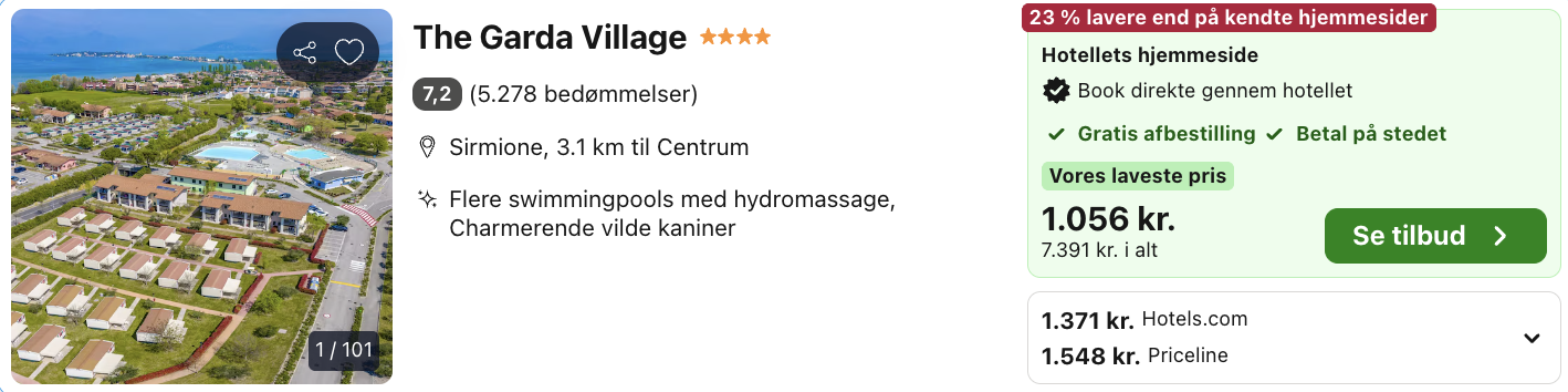 | Bemærk: Den samlede pris for hotellet/campingpladsen er 7.391,- for 4 personer, hvilket svarer til 1.848,- per person. |