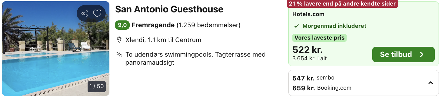Hvis rejsen er med “Vis fly” og “Vis hotel” link, så er der tale om en sammensat rejse. Det vil sige at fly og hotel skal bestilles hver for sig. Prisen vi angiver vil dog være samlet for fly og hotel med mindre andet er angivet.