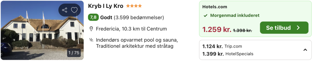 Bemærk: Den samlede pris for opholdet er 1.124,- for 2 personer i et dobbeltværelse, hvilket svarer til 562,- per person. Der kan være mindre prisforskelle på mobil og pc. Undersøg med fordel, hvor det er billigst inden bestilling.