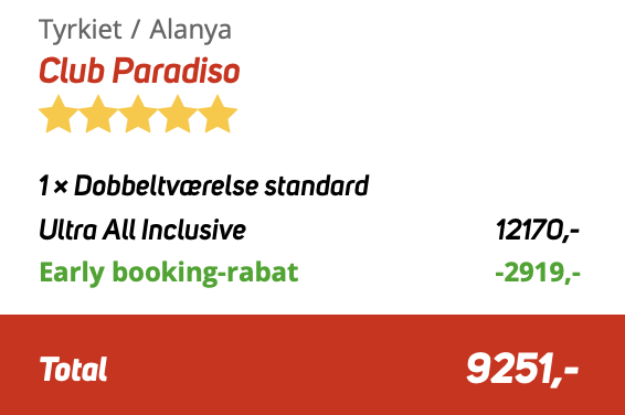 Corendon viser den samlede pris for to personer på 9.251,- hvilket svarer til 4.626,- per person.