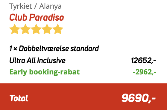 Corendon viser den samlede pris for to personer på 9.690,- hvilket svarer til 4.845,- per person.