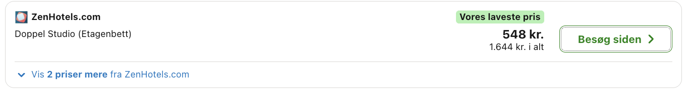 Hvis rejsen er med “Vis fly” og “Vis hotel” link, så er der tale om en sammensat rejse. Det vil sige at fly og hotel skal bestilles hver for sig. Prisen vi angiver vil dog være samlet for fly og hotel med mindre andet er angivet.