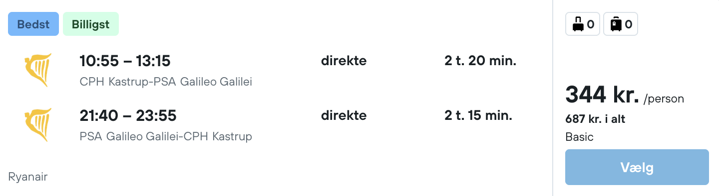 På vores flysøgemaskine har vi fundet billige flybilletter fra København til Pisa: