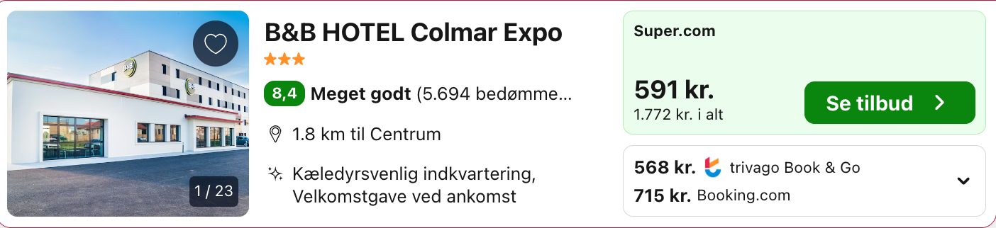 | Bemærk: Husk at lade søgningen blive helt færdig. Der kan være mindre prisforskelle på mobil og pc. Undersøg med fordel, hvor det er billigst inden bestilling. Vælg Laveste Pris på Trivago.
