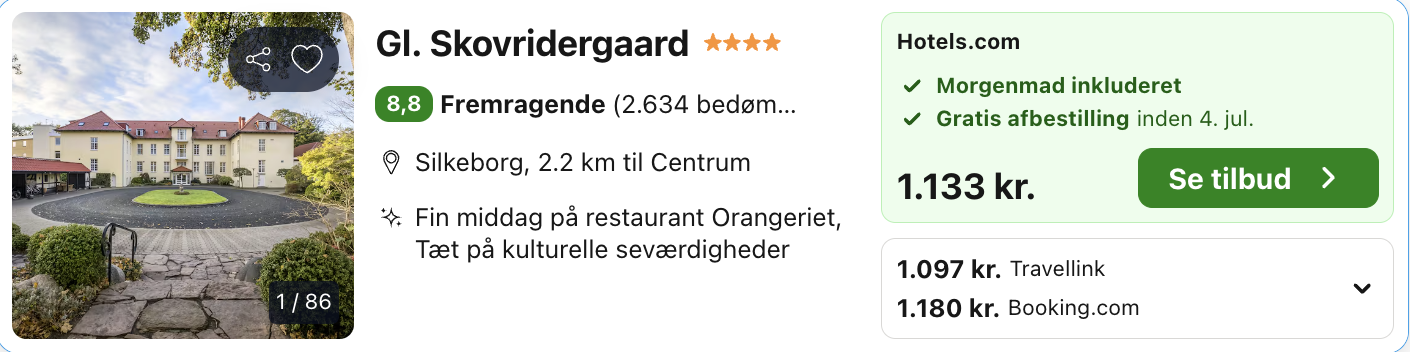 Bemærk: Den samlede pris for 2 personer i et dobbeltværelse er 1.097,- hvilket svarer til 549,- per person. Der kan være mindre prisforskelle på mobil og pc. Undersøg med fordel, hvor det er billigst inden bestilling Rejs365 er ikke et rejsebureau, men en rejseside, der finder gode tilbud! – Vi modtager kommission, men det påvirker ikke din pris! Læs mere her |