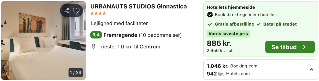 | Bemærk: Husk at lade søgningen blive helt færdig. Vælg Laveste Pris på Trivago. Der kan være mindre prisforskelle på mobil og pc. Undersøg med fordel, hvor det er billigst inden bestilling.