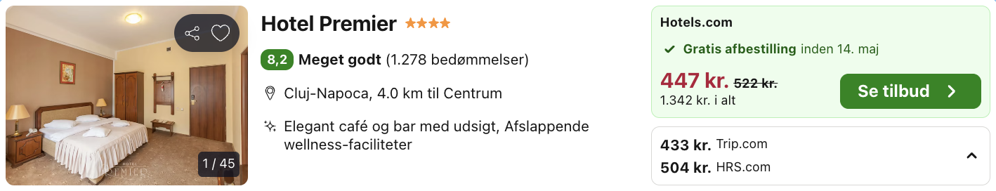 | Bemærk: Den samlede pris for hotellet er 1.298,- for to personer i et dobbeltværelse, hvilket svarer til 649,- per person. |