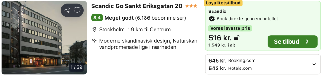 Scandic Go Sankt Eriksgatan 20 ligger centralt i Stockholm i bydelen Kungsholmen, tæt på både Vasastan og byens vigtigste knudepunkter. Hotellet er indrettet i Scandic Go-konceptets moderne og minimalistiske stil med kompakte, funktionelle værelser, hvor fokus er på komfort, gode senge og en effektiv indretning. Stemningen er urban og afslappet, perfekt til storbyrejsende, der ønsker en smart og prisvenlig base midt i byen.