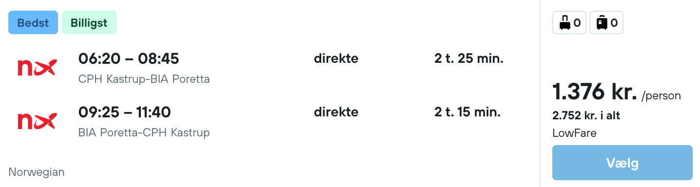 Flyprisen inkluderer kun en lille taske, men bagage kan tilkøbes.