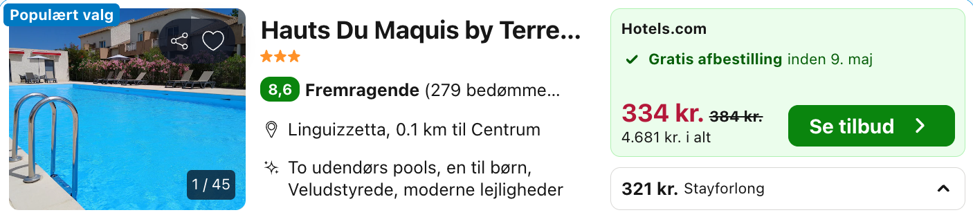 Hvis rejsen er med “Vis fly” og “Vis hotel” link, så er der tale om en sammensat rejse. Det vil sige at fly og hotel skal bestilles hver for sig. Prisen vi angiver vil dog være samlet for fly og hotel med mindre andet er angivet.