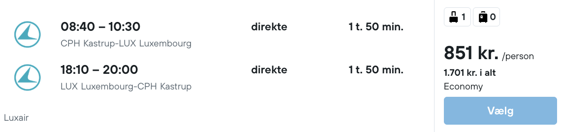 På vores flysøgningsmaskine har vi fundet billige flybilletter fra København til Luxembourg: