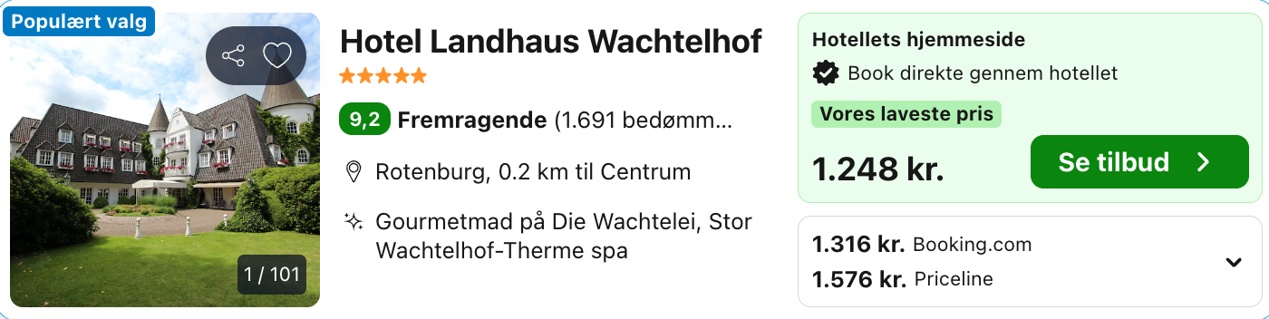 Bemærk: Den samlede pris for opholdet er 1.248,- for 2 personer i et dobbeltværelse, hvilket svarer til 624,- per person.