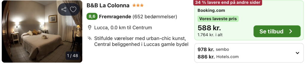 B&B La Colonna ligger centralt i den historiske by Lucca i Toscana, tæt på byens berømte bymure og i gåafstand til de fleste seværdigheder. Overnatningsstedet har en charmerende og autentisk atmosfære med værelser indrettet i klassisk italiensk stil, hvor detaljer som træmøbler og varme farver skaber en hyggelig og hjemlig stemning. Det er et oplagt valg for rejsende, der ønsker at opleve Luccas historiske charme helt tæt på.