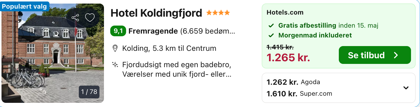 Bemærk: Der kan være mindre prisforskelle på mobil og pc. Undersøg med fordel, hvor det er billigst inden bestilling. Den samlede pris for opholdet er 1.262,- for 2 personer i et dobbeltværelse, hvilket svarer til 631,- per person. Rejs365 er ikke et rejsebureau, men en rejseside, der finder gode tilbud! – Vi modtager kommission, men det påvirker ikke din pris! Læs mere her