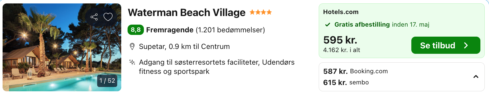 Hvis rejsen er med “Vis fly” og “Vis hotel” link, så er der tale om en sammensat rejse. Det vil sige at fly og hotel skal bestilles hver for sig. Prisen vi angiver vil dog være samlet for fly og hotel med mindre andet er angivet.