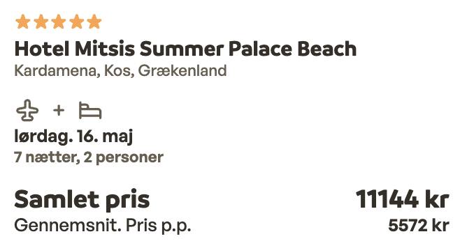 Hvis rejsen er med “Vis fly” og “Vis hotel” link, så er der tale om en sammensat rejse. Det vil sige at fly og hotel skal bestilles hver for sig. Prisen vi angiver vil dog være samlet for fly og hotel med mindre andet er angivet.