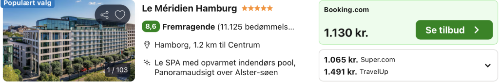 Vi har taget udgangspunkt i et ophold fra den 14. – 15. juni på Designhotellet Le Méridien Hamburg, der ligger midt i byen med en fantastisk udsigt til søen Außenalster. Du kan spise på Heritage Restaurant and Bar på 9. sal og frit benytte helseklubben med fitnesscenter og pool. Hotellet har også gratis wi-fi overalt.