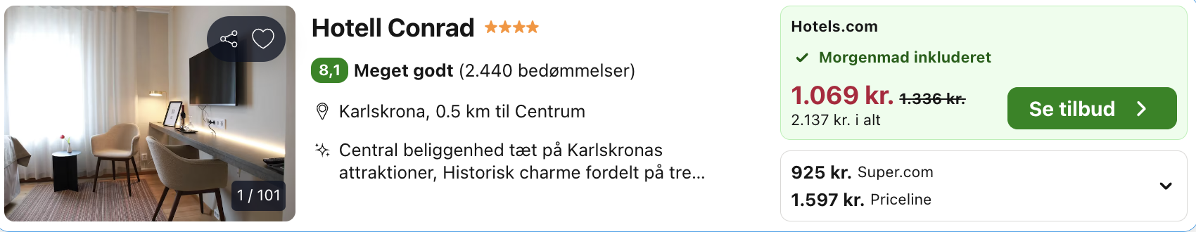 Midt i den charmerende kystby Karlskrona ligger Hotell Conrad – et hyggeligt og personligt hotel med en hjemlig atmosfære. Her bor du tæt på byens historiske centrum, marinaen og det smukke skærgårdsmiljø, som Karlskrona er kendt for.