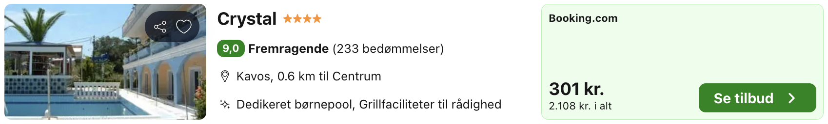 Hotel Crystal i Kavos på Korfu er et enkelt og afslappet hotel, der ligger i grønne og rolige omgivelser tæt på både strand og byliv. Her bor man i den sydlige del af øen, hvor tempoet kan variere mellem afslappende stranddage og livlige aftener i Kavos centrum, som ligger inden for kort afstand.