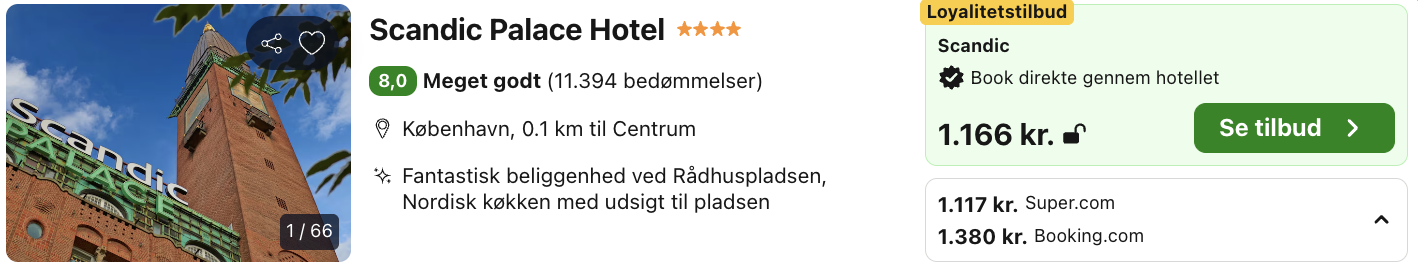 Scandic Palace Hotel er et ikonisk hotel med en enestående beliggenhed på Rådhuspladsen i hjertet af København. Hotellet kombinerer historisk elegance med moderne komfort og er et oplagt valg for både feriegæster, der ønsker at bo centralt med byens største seværdigheder lige uden for døren.