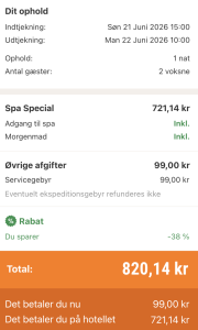 Bemærk: Den samlede pris for opholdet er 820,- for 2 personer i et dobbeltværelse, hvilket svarer til 410,- per person inkl. obligatorisk ekspeditionsgebyr på 99,-. Rejs365 er ikke et rejsebureau, men en rejseside, der finder gode tilbud! – Vi modtager kommission, men det påvirker ikke din pris! Læs mere her