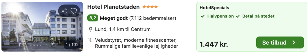 Vi har taget udgangspunkt i et ophold fra den 4. – 5. juli på First Hotel Planetstaden, der er et moderne og stilfuldt hotel beliggende tæt på centrum af Lund i Sverige. Hotellet råder over 195 værelser, der er indrettet med fokus på kvalitet og komfort og tilbyder blandt andet faciliteter som elkedel, hårtørrer, sofagruppe, tekøkken og i nogle tilfælde også balkon.