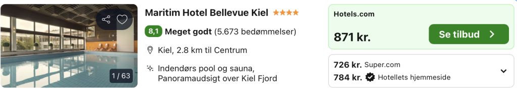Vi har taget udgangspunkt i et ophold fra den 9. – 10. maj på Maritim Hotel Bellevue Kiel, der tilbyder en uforglemmelig opholdserfaring i den smukke havneby Kiel, der ligger ved Østersøen i det nordlige Tyskland. Med sin enestående beliggenhed lige ved vandet og med panoramisk udsigt over Kiel Bugt, er hotellet et ideelt valg for både forretningsrejsende og feriegæster, der ønsker at nyde både afslapning og aktiviteter i denne charmerende by.