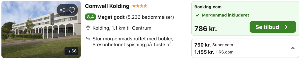 Vi har taget udgangspunkt i et ophold fra den 4. – 5. juli på 4-stjernede Comwell Kolding, der ligger omgivet af smuk natur med et stort udvalg af kulturelle aktiviteter og muligheder for fysiske aktiviteter i nærheden. Det gør et ophold på Comwell Kolding perfekt til par såvel som familier.