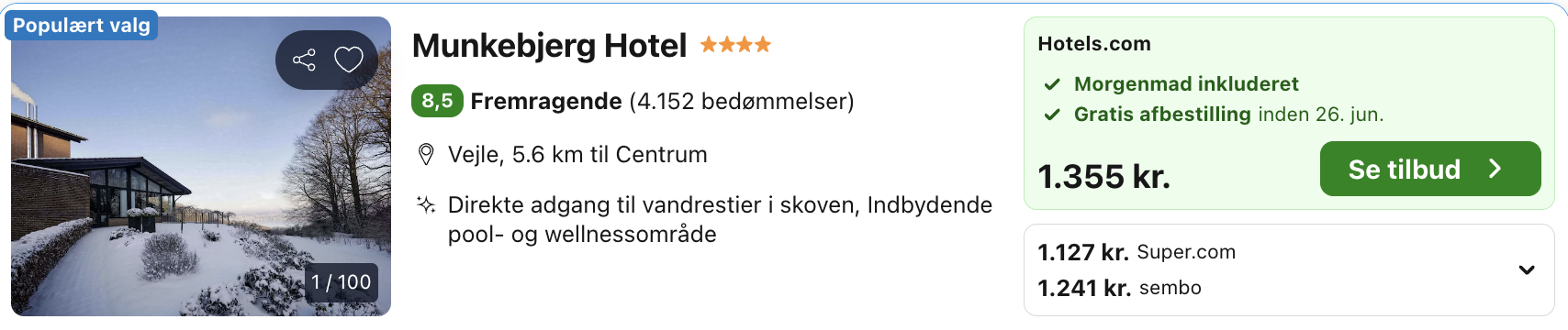 Munkebjerg Hotel er en elegant perle beliggende midt i naturskønne omgivelser ved Vejle Fjord. Hotellet er kendt for sin unikke placering omgivet af skov og med udsigt over vandet, hvilket gør det til en ideel destination for dem, der søger afslapning, forkælelse og smukke omgivelser.