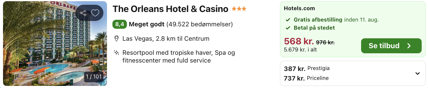 | Bemærk: Hotellet i Las Vegas koster 3.866,- inkl. for to personer i et dobbeltværelse, hvilket svarer til 1.933,- per person. Dette inkluderer resortgebyr på 2.482,- for hele opholdet, hvilket svarer til 1.241,- per person. |
