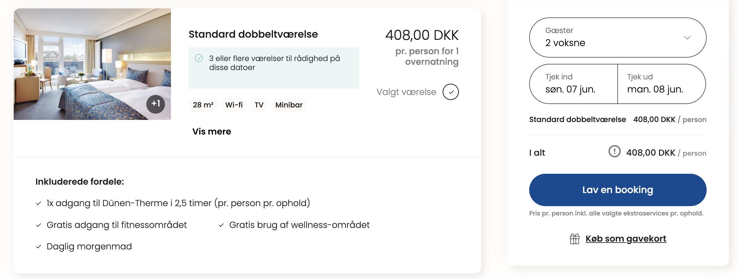 Vi har taget udgangspunkt i et weekendophold fra den 7. – 8. juni, men der er andre datoer i maj og juni på Ambassador Hotel & Spa til gode priser.