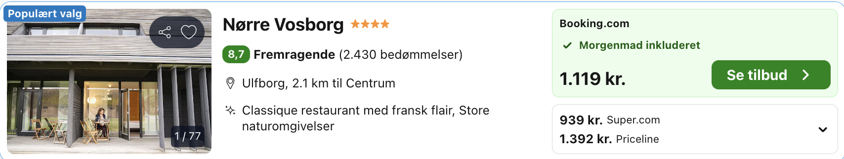 Bemærk: Den samlede pris for opholdet er 939,- for 2 personer, hvilket svarer til 470,- per person. Der kan være mindre forskelle i prisen på mobil og pc. Undersøg med fordel, hvor det er billigst inden bestilling.