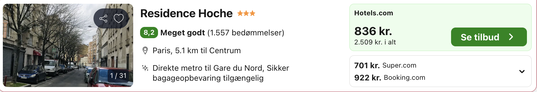 | Bemærk: Der kan være mindre prisforskelle på mobil og pc. Undersøg med fordel, hvor det er billigst inden bestilling. Vælg “Vores laveste pris” på trivago, for at opnå den bedste pris på hotellet.