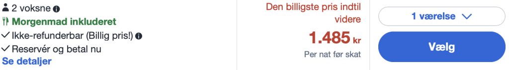 Bemærk: Den samlede pris for opholdet er 1.485,- for 2 personer i et dobbeltværelse, hvilket svarer til 743,- per person.