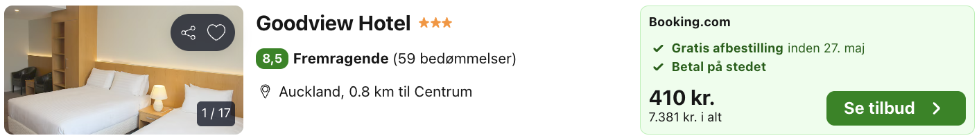 Rejs365 er ikke et rejsebureau, men en rejseside, der finder gode tilbud! – Vi modtager kommission, men det påvirker ikke din pris! Læs mere her Udrejse fra København er den 28. maj, mens ankomst i Auckland er den 30. maj. |
