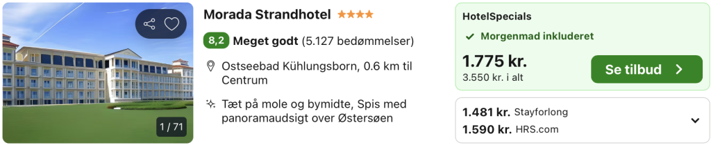 Vi har taget udgangspunkt i et ophold fra den 27. – 29. marts på Morada Strandhotel, der ligger direkte ved Østersøen i den charmerende badeby Kühlungsborn med udsigt til havet og den lange træmole. Hotellet tilbyder lyse værelser med balkon, en restaurant og bar med panoramaudsigt samt et stort wellnessområde med pool, sauna og spa. Den centrale beliggenhed tæt på strand, marina, caféer og shopping gør hotellet til et ideelt valg for en afslappende ferie med fokus på velvære og hyggelige gåture langs vandet.